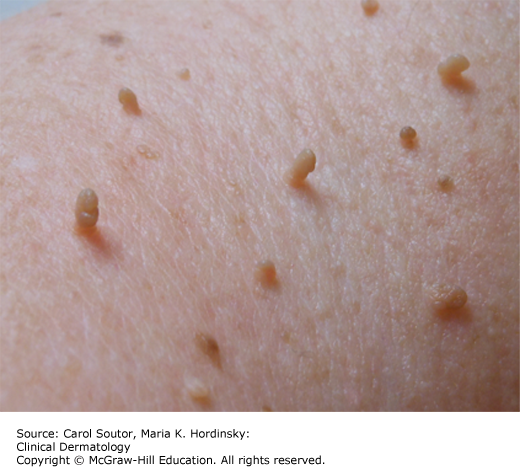 Skin tags are very common skin-colored papules with a thin stalk (Figure 16-6). The stalk contains a central blood vessel. They most commonly present in patients in their mid-40s to late 60s in sites of friction such as the neck, axillae, and groin. Weight gain correlates with an increased incidence.