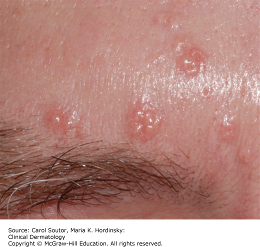 Sebaceous hyperplasia presents as a 2- to 4-mm yellow- to skin-colored papule(s) on the central face and forehead (Figure 16-7). They represent a hyperplasia of sebaceous glands. They often have a central depression.