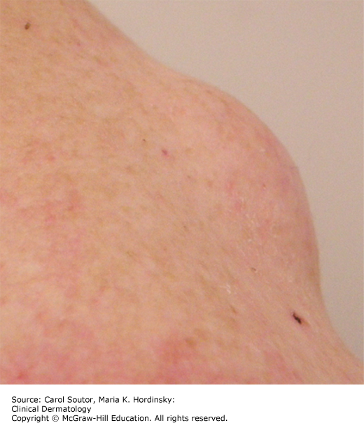 A lipoma represents a localized overgrowth of fat cells. A lipoma often presents as a rubbery nodule in areas of potential inadvertent trauma (Figure 16-8). The tendency to form lipomas appears to run in families and a number of syndromes present with multiple lipomas that may number from a few to hundreds. Lipomas come in two main variants, classic and angiolipoma. The angiolipoma variant clinically is similar to the classic lipoma but may have an associated tenderness. These lesions lead to a deep aching sensation with minor pressure or trauma and can be quite distressing to the patient.