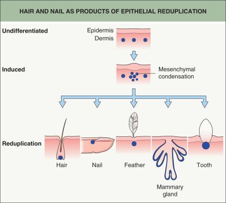 Skin adnexa in mammals develop through evolutionarily conserved mechanisms. Similar processes lead to modifications of epithelial cells and proteins in order to form functional structures such as hairs, feathers, nails, glands, and teeth. In all cases, adnexa result from interactions between adjacent tissue layers, the ectoderm (epidermis) and underlying mesoderm (dermis) ( Fig. 68.1 ). For example, the hair follicle (HF) first arises as a small epidermal bud and then, via reciprocal signaling involving the underlying dermis, progresses to a complex, multi-cylindrical organ with associated sebaceous and apocrine glands (see Fig. 2.4 ). The developmental relationships among different adnexal structures is evidenced by the hair, nail, sweat gland, and tooth defects observed in ectodermal dysplasias (see Ch. 63 ).
