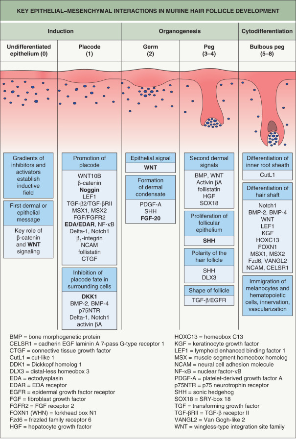 After determination of placode fate, reciprocal signaling between the mesenchyme and epithelium continue to drive HF morphogenesis through a complex interplay among secreted molecules (see Fig. 68.2 ). Fibroblast growth factor (FGF)-20 secreted by the placode promotes formation of a dermal condensate . A second dermal signal follows, which induces proliferation of the epidermis and invasion of the dermis by a column of epithelial cells that forms the hair germ (stage 2), followed by the hair peg (stage 3–4) and subsequently the bulbous peg (stage 5–8) (see Fig. 68.2 ) . WNT and EDAR signaling control the expression of sonic hedgehog (SHH), which drives the downgrowth of the hair germ . Primary cilia on dermal cells within the condensate coordinate SHH signaling. In mice that lack SHH or have abnormal cilia, the dermal condensate forms but proliferation and downgrowth of the epithelium are arrested . Hemidesmosomal integrins also have a physical role in hair germ development, and mice with deficient β1 or β4 integrins have hair germs that cannot remodel their basement membrane and descend into the dermis .