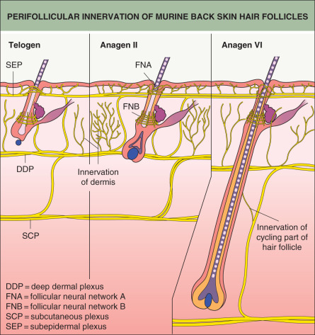 Complex neural networks develop in conjunction with HF morphogenesis. Nerve fibers arrive in the skin first and are located at presumptive follicular sites, running parallel to a dense network of blood vessels ( Fig. 68.3 ). Developing follicles become innervated around stage 5, with nerve fibers encircling the isthmus and bulge regions . Neurotrophins released from the follicular epithelium regulate this innervation, and in turn the nerves may influence the stem cell niche of the HF . Similarly, signaling proteins that promote angiogenesis, such as vascular endothelial growth factor (VEGF), are released from the epithelium and affect development of the vascular network surrounding HFs .
