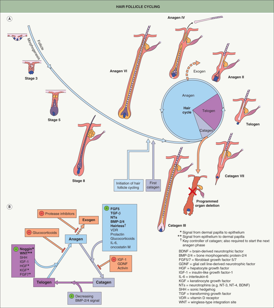 Telogen begins when the dermal papilla reaches the base of the permanent portion of the HF. The duration of telogen can be as short as 2 days in mice and as long as 3 months for human scalp hairs. The hair germ is derived from the bulge during the catagen-to-telogen transition and lies inferior to the bulge, separating the latter from the dermal papilla . As in HF morphogenesis, epithelial–mesenchymal cross-talk is required to activate the new anagen phase. Anagen progression recapitulates the middle and later stages of HF development, and many factors that drive follicle morphogenesis (e.g. WNT, SHH, noggin) also play important roles in telogen-to-anagen transition ( Fig. 68.4B ). The bulge is relatively quiescent during telogen, traditionally referred to as the “resting” phase, due to inhibitory signals (e.g. FGF-18, BMP-6) from keratin 6-positive inner bulge cells . The apparent dormancy of the HF during telogen may be an energy-efficient adaptation allowing for the maintenance of stem cells in preparation for the next anagen phase .