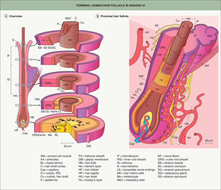 hair follicle, anagen, catagen, telogen, hair cycle, exogen, trichocytes, hair shaft, onychocytes, nail apparatus, nail plate, nail matrix, pilosebaceous unit, nail fold, immune privilege, stem cells, hair bulge
