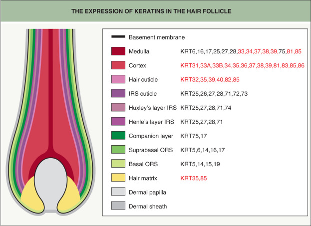 The companion layer contains only one type II keratin, the epithelial KRT75, which is also expressed in the medulla of the hair shaft and the fungiform papillae of the tongue. Pseudofolliculitis barbae and loose anagen hair syndrome have possible links to defects in KRT75 in some patients ; KRT75 polymorphisms are also associated with reduced enamel hardness and increased risk of dental caries, highlighting the link between tooth and hair architecture . Although the ORS expresses several keratins, including KRT5/KRT14, KRT6a/KRT16, and KRT6b/KRT17 (see Fig. 68.6 ), patients with pachyonychia congenita due to mutations in the latter keratin pairs only occasionally exhibit hair abnormalities such as pili torti (primarily with KRT17 defects) .