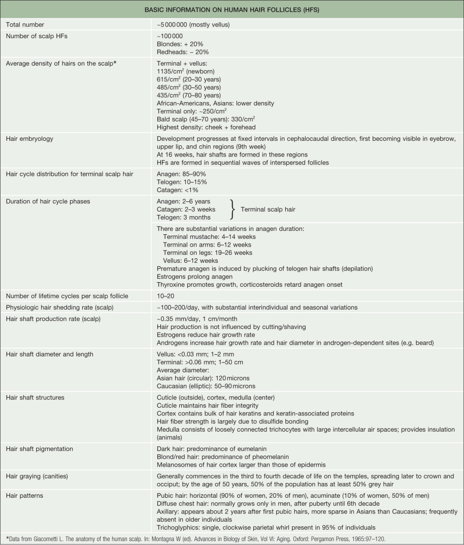 Under physiologic conditions, human HF morphogenesis occurs only once. Lanugo, vellus, and terminal hairs ( Table 68.1 ) have the same basic architecture. The first “coat” is composed of fine, long, variably pigmented lanugo hair, which is shed in an anterior-to-posterior wave during the third trimester. A second coat of fine, shorter, unpigmented lanugo hair then grows in all areas except the scalp and is shed 3–4 months after birth; pigmented scalp hairs, which have variable lengths and diameters, are also shed postnatally in an anterior-to-posterior wave. Thereafter, the hair grows in an asynchronous “mosaic” pattern rather than waves. In prepubertal children, hair is terminal on the scalp, eyelashes and eyebrows, while it is vellus on the face, trunk, and extremities. During puberty, vellus hairs in some sites become terminal hairs under the influence of androgens. Paradoxically, terminal hairs on the scalp exposed to the same androgens revert to miniaturized vellus-like hairs in androgenetic alopecia.