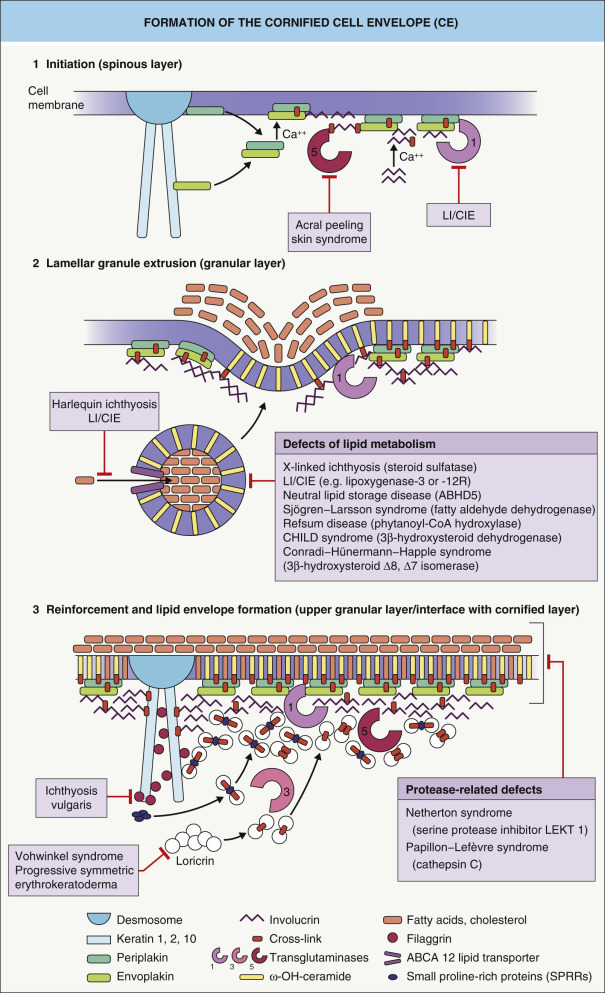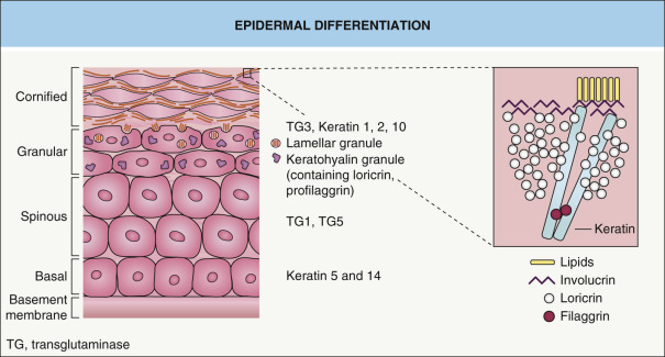 Keratinocyte terminal differentiation culminates in the replacement of the plasma membrane with the cornified cell envelope (CE), a composite of several covalently cross-linked proteins ( Fig. 56.2 ) , most of which are encoded by genes located in the epidermal differentiation cluster on chromosome 1. Examples of CE components include involucrin, small proline-rich proteins (SPRR), XP-5/late envelope proteins (LEP), loricrin, cystatin, envoplakin, periplakin, elafin, repetin, filaggrin, S100 proteins, keratins, and desmosomal proteins. Note that mutations in some of the genes that encode these proteins can lead to skin disorders (see below). The extracellular surface of the CE is covered by lipids, which form the cornified lipid envelope (CLE) (see Ch. 124 ).