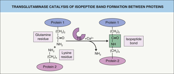 CE assembly begins within the upper spinous and granular cell layers, where proteins are chemically cross-linked, primarily by ε-(γ-glutamyl) lysine isopeptide bonds ( Fig. 56.3 ). This reaction is catalyzed by a class of enzymes termed transglutaminases (TGases). Loss-of-function mutations in the gene that encodes TGase 1 lead to lamellar ichthyosis and congenital ichthyosiform erythroderma, generalized skin disorders resulting from a failure to form proper CEs.