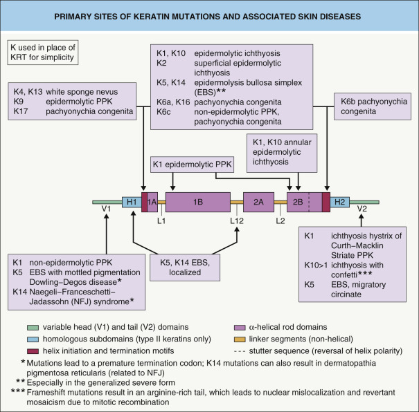 The beginning and end of the α-helical rod domain, referred to as the helix initiation and helix termination motifs, are highly conserved among the different keratins and play a pivotal role in keratin intermediate filament assembly (e.g. filament elongation). These helix boundary peptides represent genetic “hot spots” for mutations in many of the hereditary keratin disorders (see Fig. 56.5 ). The severity and other phenotypic features of genodermatoses caused by keratin defects often correlate with the position of the underlying mutation, with more severe disease resulting from mutations in the helix initiation and termination motifs (see Table 56.4 ).The head and tail regions that flank the rod domain are subdivided into extreme end (E), variable (V), and (in type II keratins) homologous (H) domains. Whereas epithelial keratins possess glycine- and serine-rich head and tail domains, these regions have a high content of cysteine and proline in hair keratins. Variations in the head and tail domains account for much of the diversity among different keratin proteins, which suggests that these domains play an important role in cell type-specific functions.