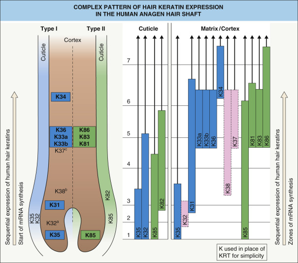 The medulla contains a mixture of epithelial keratins (KRT17, KRT75) and hair keratins (KRT33, KRT34, KRT36, KRT37, KRT81), whereas the cortex contains type I hair keratins (KRT31–KRT38) and type II hair keratins (KRT81, KRT83, KRT85 and KRT86) ( Fig. 56.6 ). Hair keratins KRT32 and KRT35 and their partners KRT82 and KRT85 are found in the cuticle, and the three IRS layers can be detected with antibodies against KRT71, KRT74, and KRT73. The epithelial keratins KRT5 and KRT14 are found throughout the full thickness of the ORS, while expression of KRT6, KRT16, and KRT17 is limited to the isthmus and the lower ORS. Additional keratins expressed in the ORS are KRT15 and KRT19.