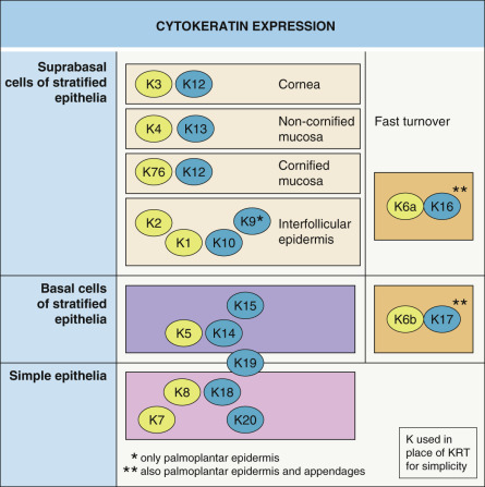 Interestingly, a number of epidermal keratins have a more restricted anatomic distribution pattern. For example, KRT9 is specifically expressed in the suprabasal cells of palmoplantar skin. KRT6, KRT16, and KRT17 are expressed not only in the palmoplantar epidermis, but also in keratinocytes of the nail bed, hair follicle, and sebaceous and sweat glands. In addition, this group of keratins is rapidly induced by injury and ultraviolet radiation, as well as in hyperproliferative conditions .