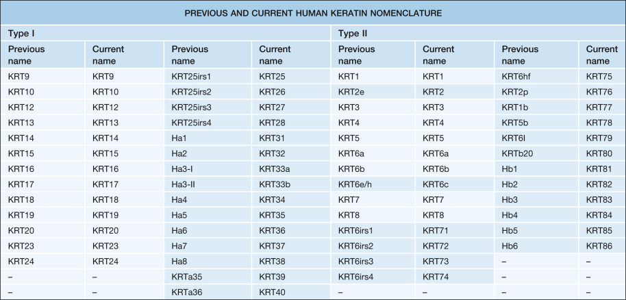 Keratin intermediate filaments provide resilience to keratinocytes, the most abundant cell type in the epidermis. Keratins represent the largest group of intermediate filament proteins ( Table 56.1 ). The current classification system includes 54 human keratin genes ( Table 56.2 ), which can be divided into three categories: (1) epithelial keratin genes; (2) hair keratin genes; and (3) keratin pseudogenes . Based upon their biochemical properties (e.g. isoelectric point, molecular weight), keratins are also classified as either type I (KRT9–KRT28, KRT31–KRT40) or type II (KRT1–KRT8, KRT71–KRT86) (see Table 56.2 ). Type I and type II keratins form obligatory heteropolymers (i.e. pairs composed of one keratin from each group) that become the basic building blocks of epithelial intermediate filaments ( Fig. 56.4 ).