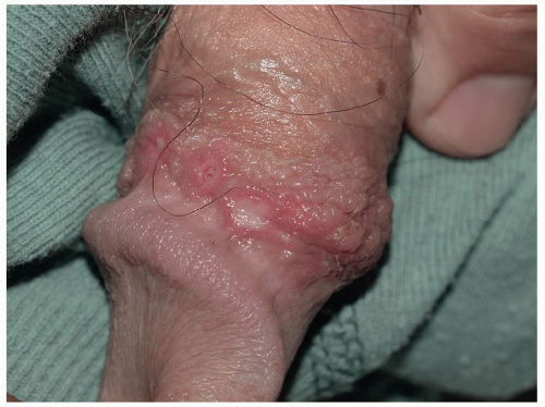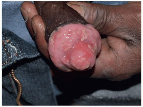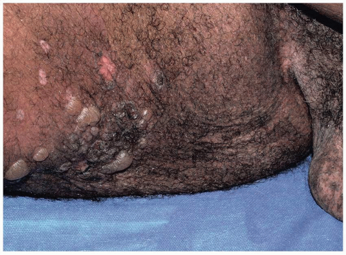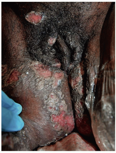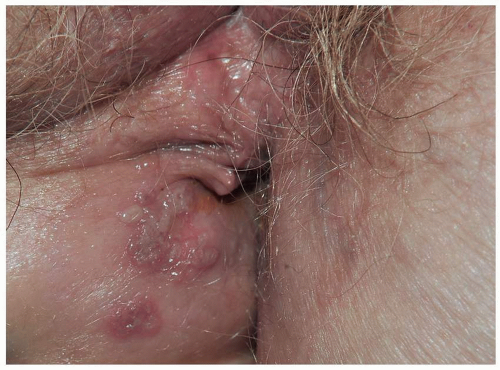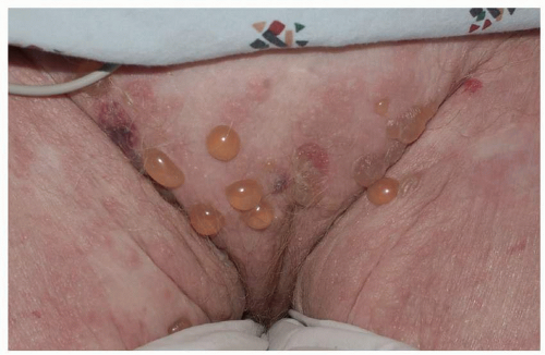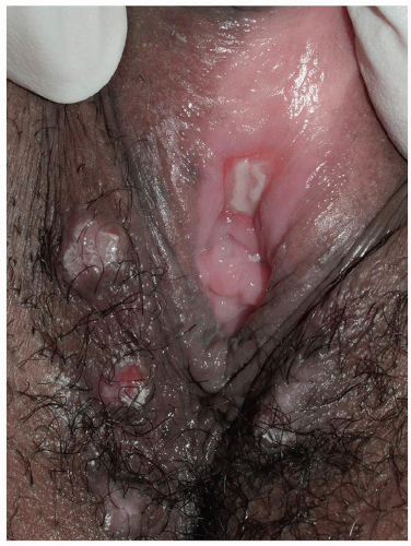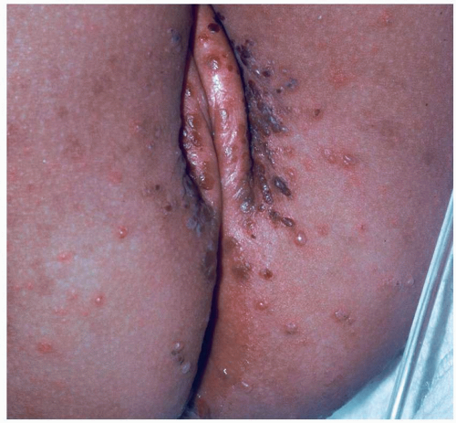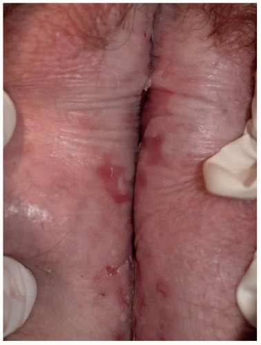 Most common in younger individuals, HSV infection is especially likely in those who have higher risks of contagion due to many lifetime sexual partners. This very common sexually transmitted disease has shown unchanging seroprevalence in the United States between 1999 and 2010 (1). There are estimates of greater than 417 million affected individuals worldwide, with the highest numbers in Africa, with large numbers also in Southeast Asia and the Western Pacific (2). HSV produces both primary and recurrent infections. Primary infection with HSV is often subclinical and unrecognized, but the classic primary infection by HSV is much more severe than recurrent episodes. Primary genital HSV infection follows exposure by 2 to 7 days and often exhibits associated fever, malaise, headache, and other constitutional symptoms. Regional lymphadenopathy is usual; pain and edema may cause urinary retention. The lesions initially occur as small (1- to 3-mm) scattered and grouped vesicles occurring typically on the glans or shaft of the penis or the mucous membrane and modified mucous membrane portion of the vulva, sometimes extending to keratinized skin (Figs. 10.1, 10.2, 10.3, 10.4, 10.5, 10.6, 10.7, 10.8 and 10.9). Because the vesicles are fragile and easily break, well-demarcated, discrete, round, and arcuate erosions (which indicate coalescing of the round erosions) often are seen in addition to intact vesicles, especially on modified mucous membrane skin. Healing may be complicated by secondary infection and irritation from overwashing or topical agents used empirically by an anxious patient.
