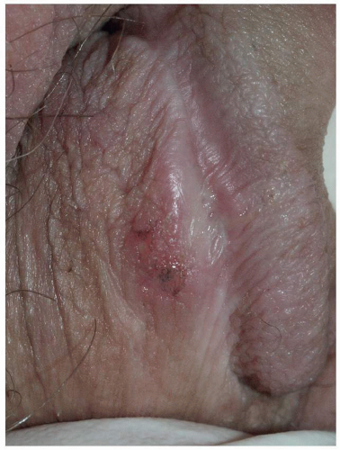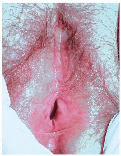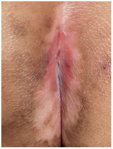 FIG. 10.19. Although pemphigus vulgaris is considered a nonscarring blistering disease, when it occurs on genital skin scarring is typical. In women, there is resorption of the labia minora and scarring over the clitoral hood; in uncircumcised men, phimosis may occur.