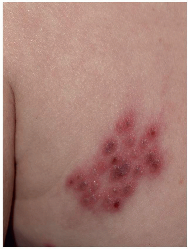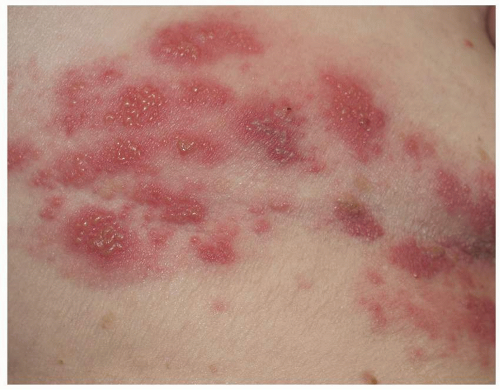Many patients experience a localized prodrome of pain, itching, burning, or aching, followed in one or a few days by pink, nonscaling papules and plaques in a unilateral dermatomal distribution (Figs. 10.12 and 10.13) in the symptomatic area. Grouped vesicles overlying these red plaques quickly follow and then coalesce into larger blisters. Often, the blisters become purple or gray due to hemorrhage into the blister. Over the next 3 weeks, the blisters crust and heal. Blisters occurring on mucous membranes and modified mucous membranes of the genitalia are quickly unroofed due to friction on this moist and very thin skin, so that erosions usually predominate. Likewise, the friction from skin folds and clothing often tears blister roofs even on the more keratinized genital skin. Herpes zoster can become disseminated, ulcerative, chronic, or hyperkeratotic in immunosuppressed patients (see Chapter 16).