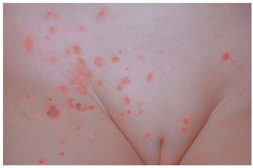 FIG. 10.7. Sacral HSV is often pruritic, and the resulting rubbing and scratching gives it an eczematous rather than vesicular appearance. Only the recurrent nature and location indicate the diagnosis. When herpes vesicles rupture, the original blistering nature is recognized by the round, coalescing nature of the erosions.
