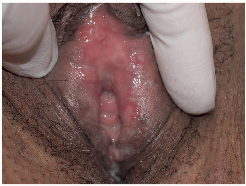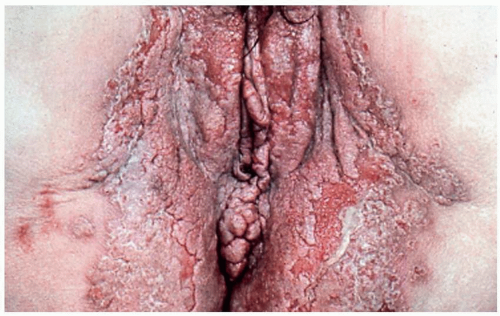Pemphigus vulgaris (common pemphigus) accounts for 80% of all patients with pemphigus. Of these, 60% present with oral lesions that may produce extensive erosion, and months may elapse before keratinized skin lesions form. More than 90% of patients with pemphigus vulgaris suffer mucosal involvement at some time during the course of the disease; genital involvement is common, occurring in about 41% patients, and 35% of women exhibit Pap smears with acantholysis and inflammation consistent with pemphigus, although these findings alone do not denote this diagnosis (18). Mucosal sites reported include nose, pharynx, esophagus, conjunctiva, cervix, vagina, and rectum, and modified mucous membranes affected include the vulva. Blisters of pemphigus occurring on these areas quickly erode, so that the first recognized lesions usually are well-demarcated, bland, nonspecific, uniform erosions (Figs. 10.16, 10.17 and 10.18). Although pemphigus is generally