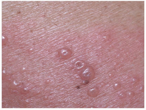 FIG. 10.13. The vesicles of herpes zoster arise from a deeper red base than do those of HSV, and bleeding into the vesicles of herpes zoster sometimes gives them a gray or purple appearance.