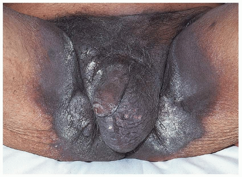 a nonscarring disease, the severely affected vulva exhibits resorption of the labia majora and the clitoris is covered by scar, and the uncircumcised penis may develop phimosis (Fig. 10.19).
