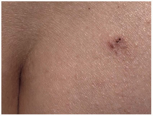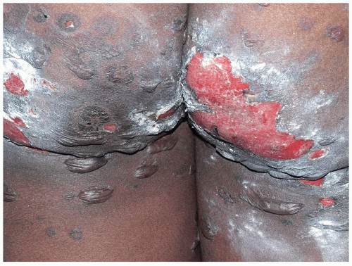 FIG. 10.15. Bullous impetigo is manifested by extremely fragile vesicles and small bullae whose blisters rupture quickly. Before rupture, the fluid is straw colored and clear because the blister is produced by a toxin that causes a split in the skin rather than a pustule from direct infection.