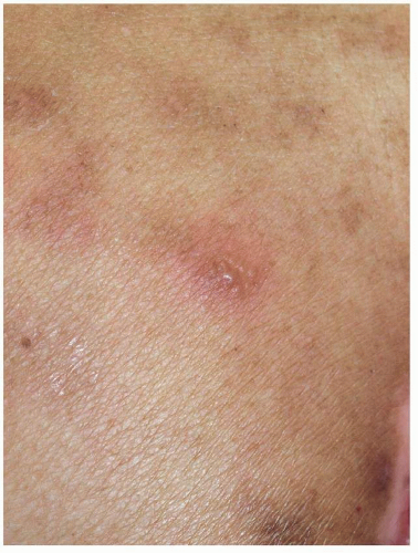 FIG. 10.8. The recurrent episodes of sacral HSV have left patches of poorly demarcated postinflammatory hyperpigmentation.