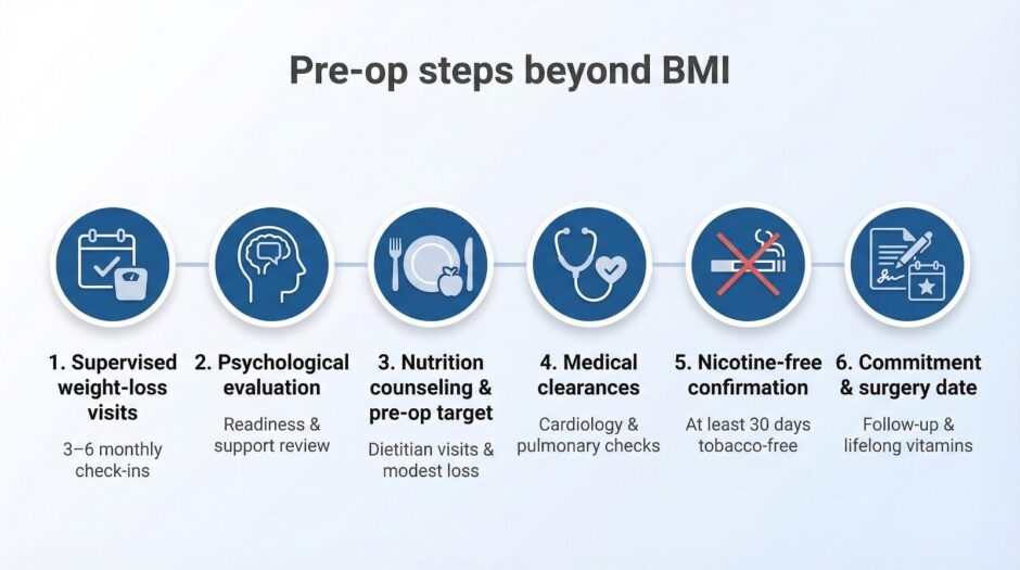 Complete these steps and every requirement—BMI, paperwork, and medical safety—locks in. Insurance issues the authorization, the OR schedule opens, and your focus shifts to packing that first-day protein shake.