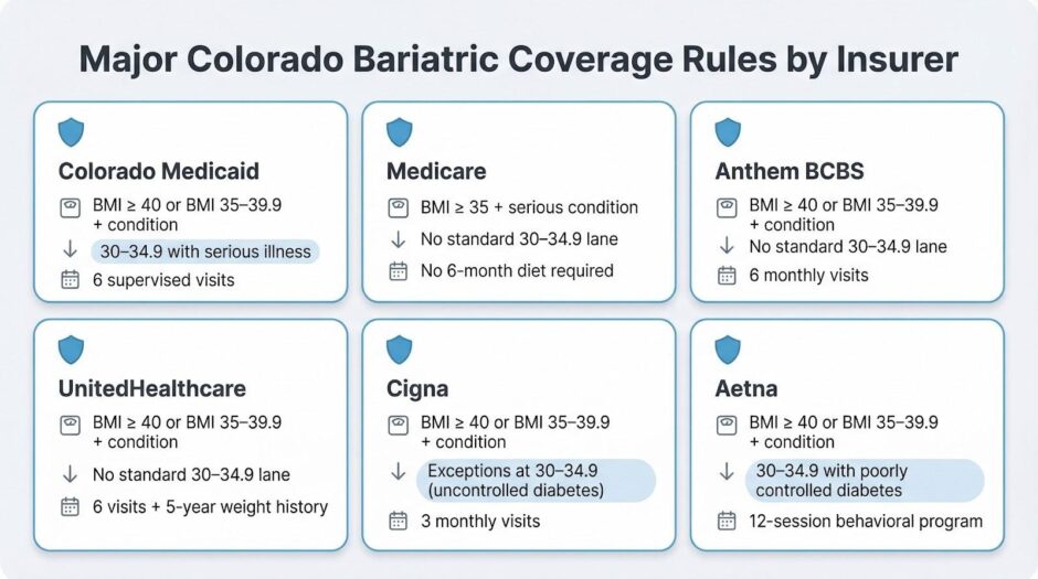 Cigna trimmed its pre-op program to three monthly weight-management visits, making it the quickest major insurer in Colorado. The BMI gates stay classic—40 alone or 35–39.9 with diabetes, sleep apnea, or another serious condition—but the timeline to approval can be as short as 90 days.