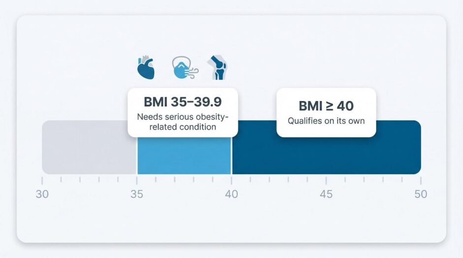 A BMI of 40 or higher qualifies for bariatric surgery on its own. A BMI of 35–39.9 still meets the mark when at least one serious obesity-related condition is present—type 2 diabetes, obstructive sleep apnea, resistant hypertension, or severe joint damage.