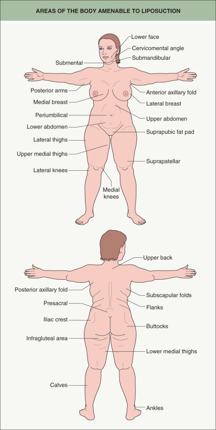 During the physical examination portion of the body contouring consultation, all anatomic sites of concern to the patient should be totally visible, i.e. unclothed. For example, tight-fitting undergarments can distort contours and mask pre-existing asymmetries or abnormalities. The patient should be examined in a standing position so that the full effects of gravity are apparent. In addition to observation, the skin should also be palpated. Grasping the skin and fatty tissues via the “pinch test” technique reveals both the thickness and firmness of the underlying fatty tissues. Determination of skin laxity as well as detection of any asymmetries, dimples, scars, hernias, musculoskeletal abnormalities, and overlying cutaneous lesions is essential. It is equally important to advise the patient of such findings and how they might affect expectations. Accurately describing individual anatomic sites in terms the patient can understand is quite helpful and may be aided by the use of schematic diagrams ( Fig. 156.1 ). Because the patient has a different vantage point than the physician, photography and/or full-length mirrors may prove useful during the consultation.