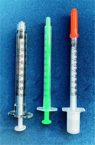 Figure 2.2). Withdrawing all product from the needle bevel will help minimize product waste before transitioning to a 30 to 32 gauge half-inch needle for the actual injection. An additional pearl to minimize product waste is to remove the vial’s cap and stopper and tilt the vial 45° to draw up any remaining droplets (