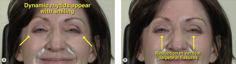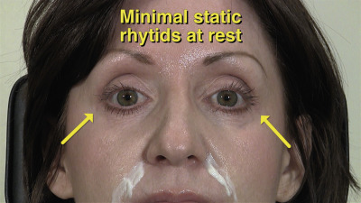| Lateral canthal lines (“crow’s feet”) with smiling; lines are mostly or entirely gone in repose |