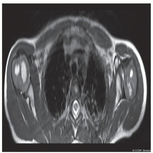 • Subluxated or dislocated humeral with glenohumeral deformity on MRI scan (Figure 10.2)