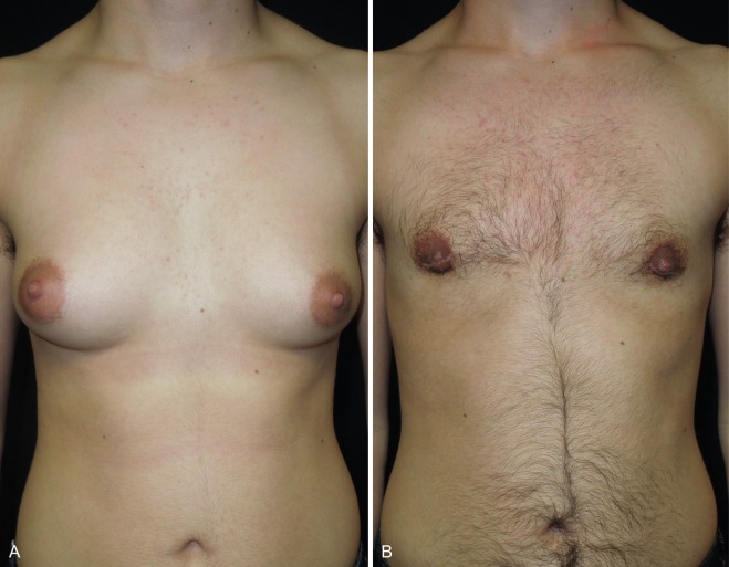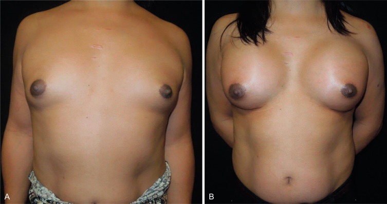 Preoperative (A) and postoperative (B) pictures of augmentation mammaplasty in a transwoman.