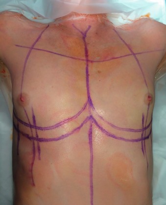 Preoperative markings for augmentation mammoplasty in a transwoman. The lower lines denote the proposed position of inframammary crease.