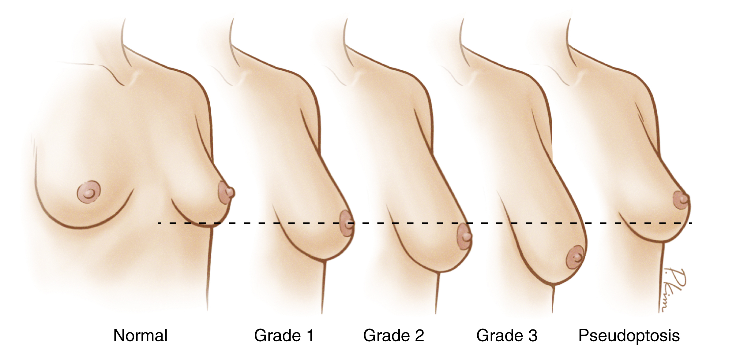 There is a common misperception that insertion of larger implants in a patient with mild ptosis or pseudoptosis will suffice as an alternative to the additional scars of a mastopexy, but that is incorrect.