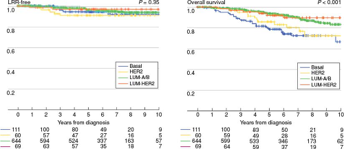 The molecular subtype has been found to be an independent predictor of recurrence-free survival and overall survival but not in-breast recurrence (IBR) after mastectomy (Fig. 20-1) (2). Surgeons cannot control the tumor biology and the patient’s germline mutations at the time of presentation and only to a certain extent, the stage at presentation and patient characteristics. The surgeon has the greatest impact on local and regional recurrence through their surgical treatment.