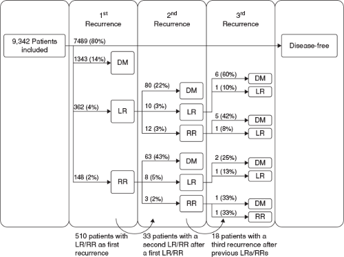 ![]() FIGURE 20-4 Flow chart of first and subsequent recurrences. LR, local recurrence; RR, regional recurrence; DM, distant metastasis. (Reprinted from Geurts YM, Witteveen A, Bretveld R, et al. Patterns and predictors of first and subsequent recurrence in women with early breast cancer. Breast Cancer Res Treat 2017;165(3):709–720. http://creativecommons.org/licenses/by/4.0/. No changes were made.) |