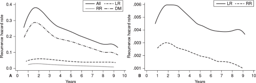 surveillance. Recurrence occurred in 1,853 women (20%). A total of 1,343 (72%) patients first presented with a distal recurrence while 362 (20%) had LR and 148 (8%) had an RR. Subsequent recurrences were also most commonly distant (Fig. 20-4). They identified that most commonly patients locally recur during the second year after treatment. RR and distant recurrences rates remain relatively constant through 10 years of follow-up (Fig. 20-5A). The annual risk of LR peaked at 2 years (0.7% [95% CI 0.5 to 0.8]) and 8 years (0.4% [95% CI 0.2 to 0.5]). The annual risk of RR peaked at 2 years (0.3% [95% CI 0.2 to 0.4]) and then decline thereafter (Fig. 20-5B).