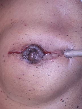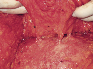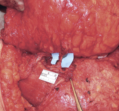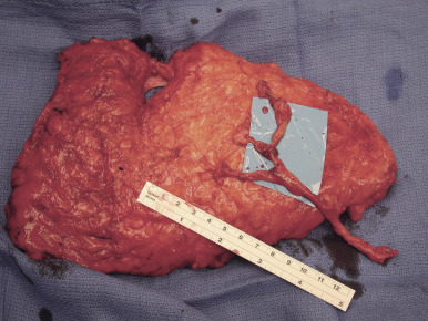 When initiating the perforator dissection, the location of the tendinous inscriptions is important. Sometimes the perforator penetrates this region of the anterior rectus sheath and, in those cases, including a small cuff of the anterior rectus sheath (1–2 mm) around the perforator is recommended ( Fig. 16.7 ). During the dissection it is imperative to preserve the lateral intercostal nerves as they pierce the rectus abdominis muscle at the junction of the lateral and central longitudinal segments. Failure to do so will likely result in abdominal weakness or bulge. Motor nerve branches that cross the perforator or the source vessel should be sharply divided in order to elevate the flap. Whether or not to coapt the severed nerve is controversial. Some advocate using a microsuture for coaptation, whereas others prefer to allow the cut end of the motor nerve to neurotize into the adjacent medial segment of the rectus abdominis muscle. The intramuscular dissection proceeds to the point that the perforator or inferior epigastric vessel becomes submuscular ( Fig. 16.8 ). At that point, the dissection continues within the retromuscular plane and progresses from the lateral edge of the muscle toward the iliac vessels. Some surgeons prefer to dissect the source vessel to its origin in order to optimize the length and the caliber of the vascular pedicle ( Fig. 16.9 ). Some surgeons prefer to dissect the pedicle to the length and caliber that is necessary in order to perform a successful anastomosis. This technique may minimize trauma to the rectus abdominis muscle and improve function. Dissection of multiple perforators can potentially compromise function of the rectus abdominis muscle if the myotomies are several in number as well as diagonal or transverse in orientation.