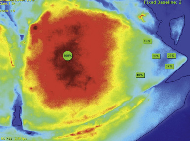 Fluorescent angiography is a relatively new technology that allows direct visualization of perfusion within a cutaneous territory. This application can be used on tissue that is elevated as a flap or on a cutaneous territory that has not been elevated ( Fig. 16.4 ). The images are captured following the intravenous injection of indocyanine green (ICG). An image-capturing laser is then positioned a few inches above the cutaneous territory to be imaged. This device is linked to a computer that analyzes the data and generates a real-time image based on the fluorescence of the ICG. Images are obtained about 15 s after the ICG injection. In the setting of flap reconstruction, the images can be captured prior to, during, and following flap elevation, as well as postoperatively.