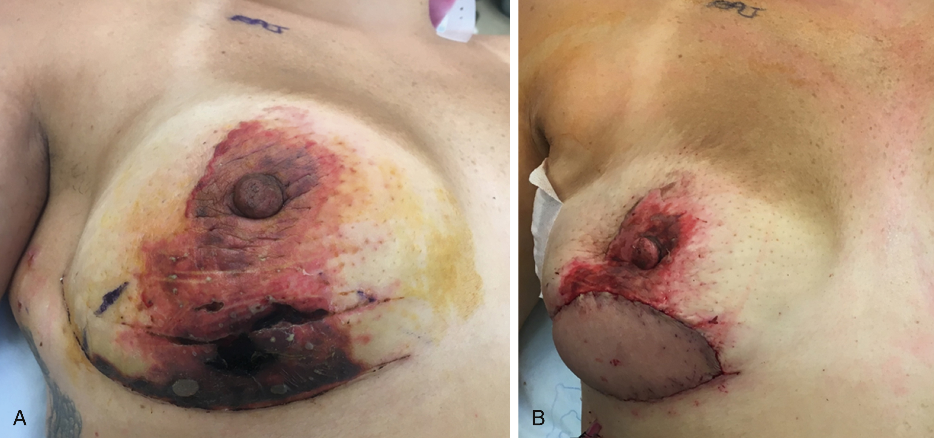 (A) Photograph of a patient 2 weeks after nipple-sparing mastectomy through an IMF incision. Note ischemia of the triangle below the nipple. (B) Immediate postoperative photograph after salvage with thoracodorsal artery perforator flap .