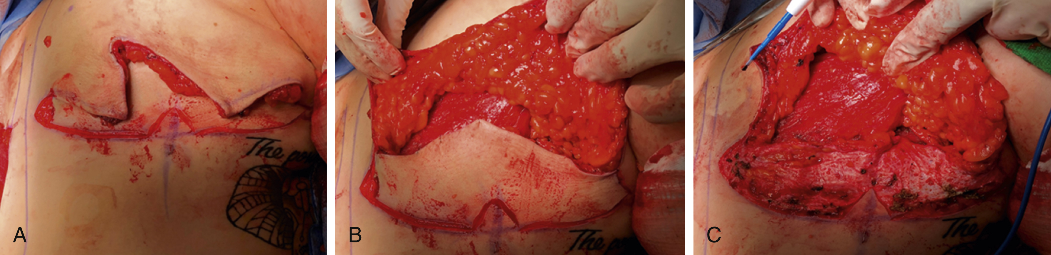 Once the flap has been harvested, it is weighed and transferred up to the chest for microvascular anastomosis. In most cases, a flap harvested from the contralateral abdominal wall is used since this orientation allows the pedicle vessels to run along the medial border of the chest and place the SIEV in close proximity to the internal mammary vessels, giving the surgeon the option of additional venous outflow or supercharging of the flap. However, an ipsilateral flap is also commonly performed if the perforating vessels in this area are superior in size/caliber as compared with the contralateral flap. In this case, the SIEV can easily be anastomosed to the axillary vessels if necessary. Following microvascular anastomosis, the flap is shaped and secured to the chest wall. Any twisting, kinking, or tension on the pedicle should be avoided. A skin paddle is usually left visible for postoperative flap monitoring, and the remainder of the flap is de-epithelialized. The skin is closed in layered fashion after placement of a closed suction drain.