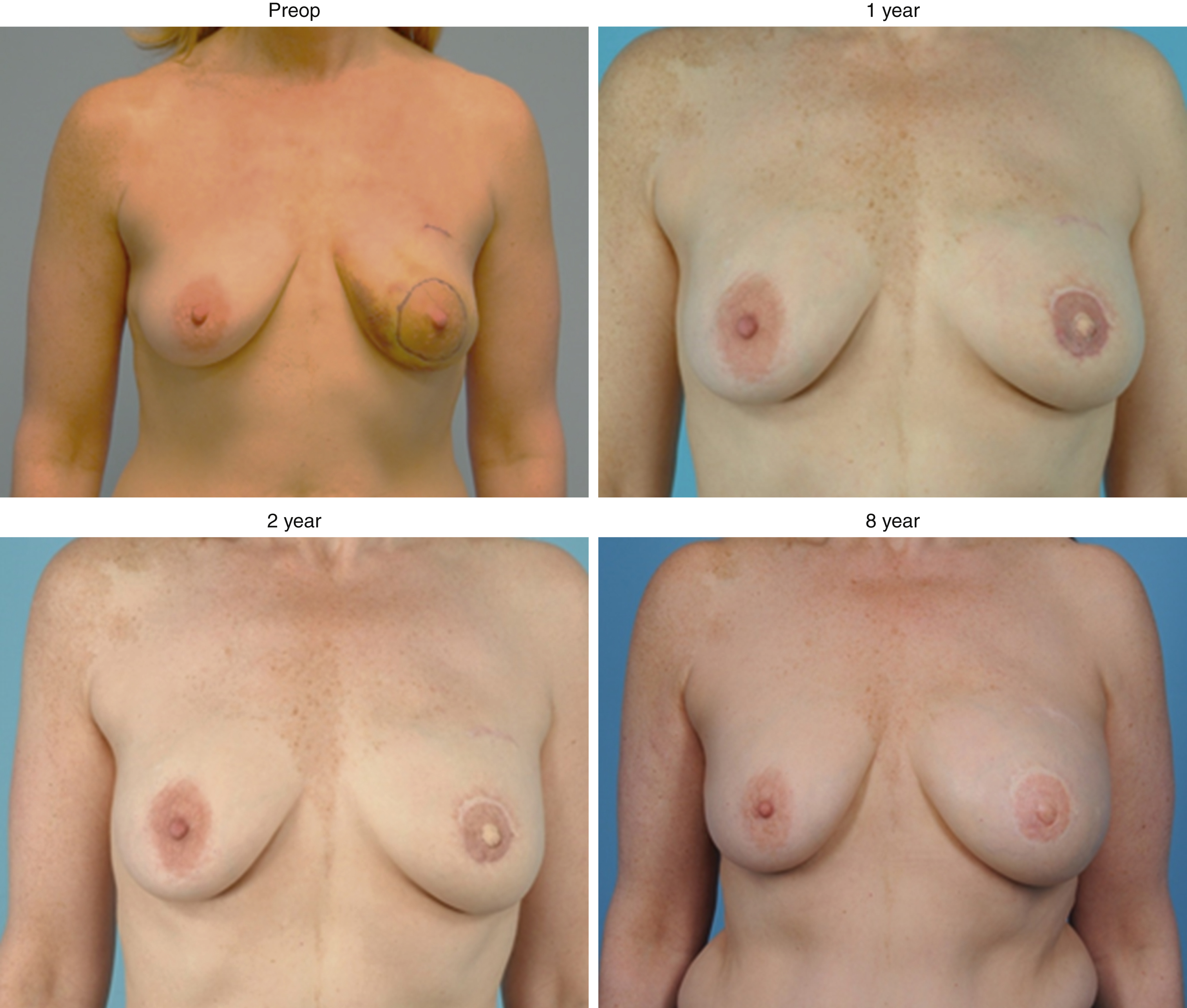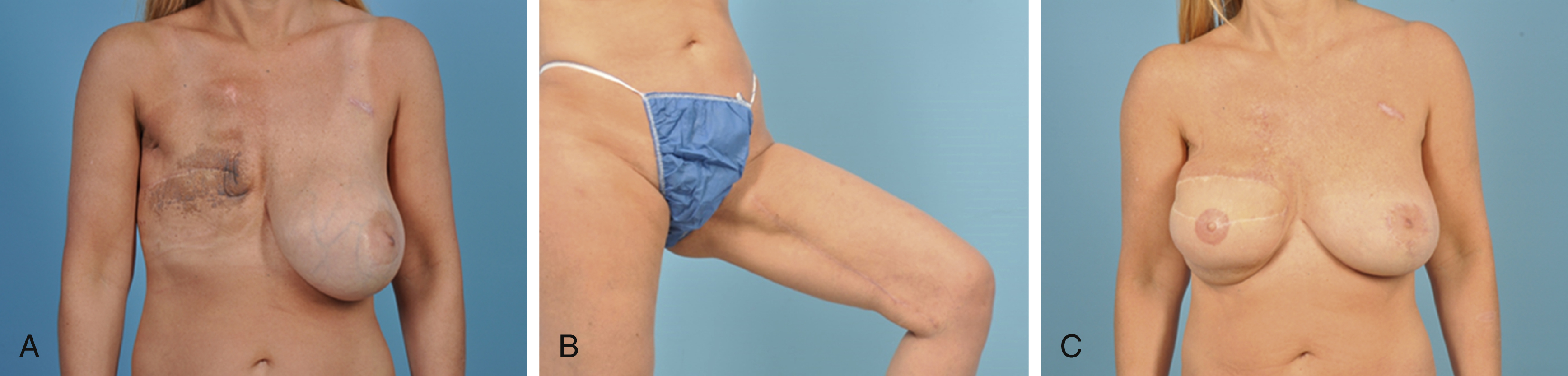 Autologous tissue breast reconstruction, in the appropriately selected patient, offers several advantages over implant-based techniques. This approach usually results in a more natural-appearing and more natural-feeling reconstructed breast and avoids the long-term complications of breast implants such as capsular contracture, implant rupture, and asymmetry due to weight gain or aging ( Fig. 36.4 ). Autologous breast reconstruction is, however, more technically challenging and demands a thorough understanding of anatomy and tissue perfusion. As a result, progress in surgical techniques together with advanced knowledge of anatomy have led to continuous improvement and evolution of autologous breast reconstruction resulting in better esthetic outcomes and decreased donor site morbidity.
