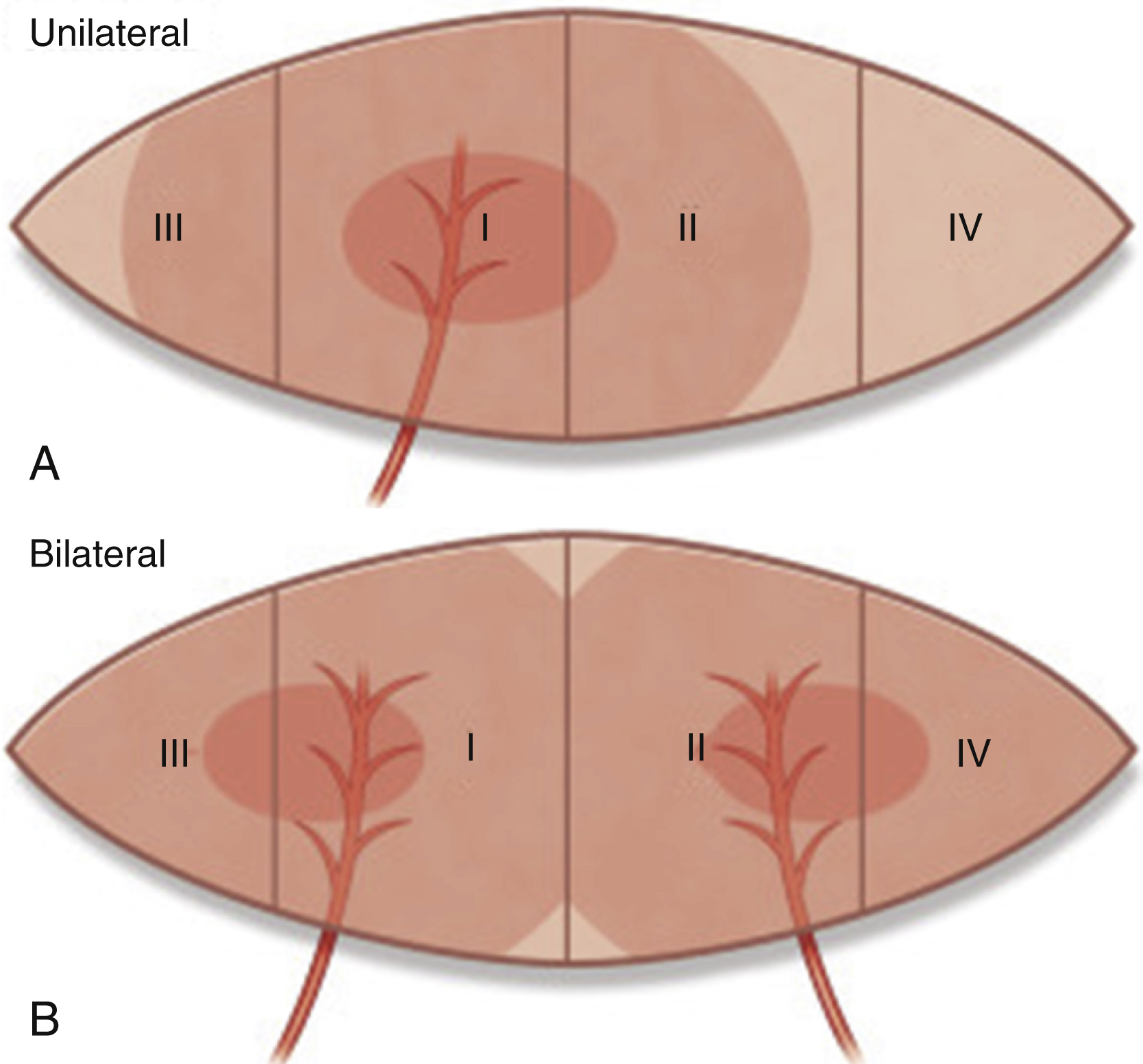 Hartrampf divided the abdominal tissues into four zones: zones 1 and 2 are ipsilateral to the harvested muscle while zones 3 and 4 cross the midline to the other side ( Fig. 36.5 ). Zones 1 and 2 can be consistently transferred with a pTRAM. However, extended flaps with large segments of zone 3 are less reliable and susceptible to distal necrosis. Zone 4 is not well perfused and should not be used with a pTRAM. Perfusion across the midline of the abdomen can be improved by anastomosing the deep inferior epigastric vein to a recipient vein in the axilla, a process known as supercharging a flap. Less commonly, the deep inferior epigastric artery may also require anastomosis. Another option is to delay the flap by incising the skin and ligating the deep inferior epigastric vessels 2–4 weeks prior to flap transfer. Other authors have described the use of bipedicle TRAM flaps in which both rectus muscles are harvested, thus providing a dual blood supply to the skin. This surgical approach enables transfer of virtually all of the lower abdominal skin/fat and greatly increases the perfusion of the flap even in patients with comorbid conditions such as obesity; however, removal of both rectus muscles can be quite morbid, decreasing abdominal/core strength and resulting in higher rates of hernia formation as compared to a unilateral pTRAM or other abdominally-based flaps.