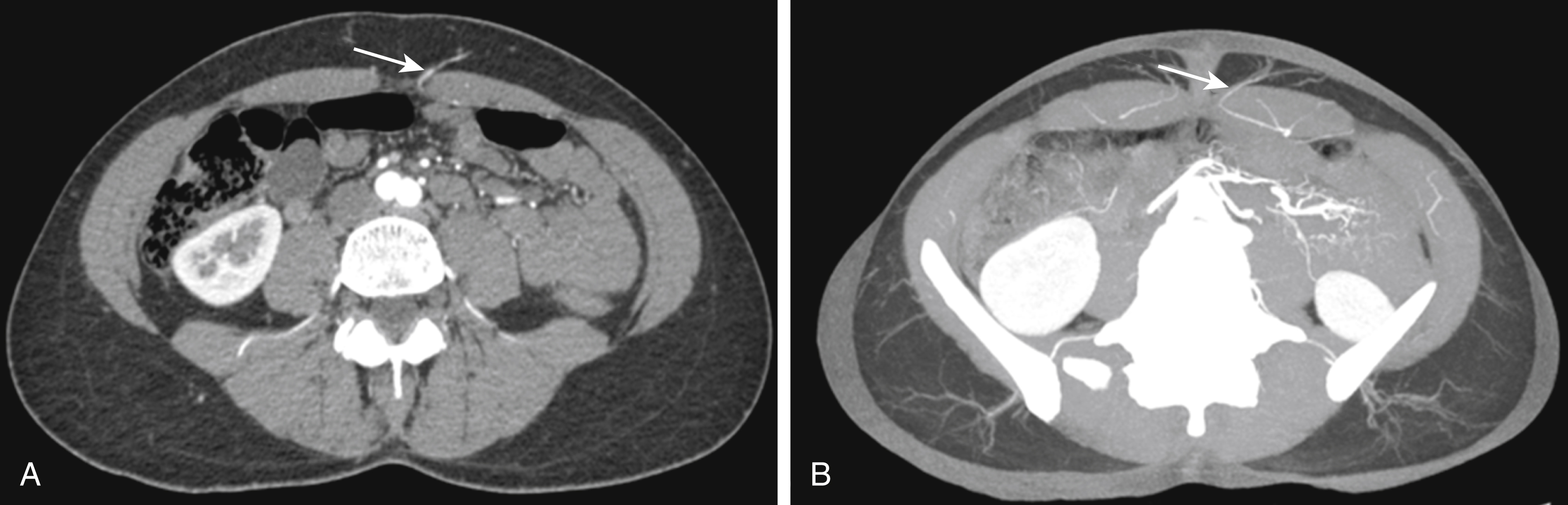 The DIEP flap is the natural evolution of the muscle-sparing flap. In this procedure, the perforating vessels that perfuse the skin are dissected free from the rectus muscle, and the innervation of the muscle is largely maintained. The size and location of the abdominal wall perforators can be assessed preoperatively using computed tomographic angiography (CTA) or magnetic resonance angiography (MRA) ( Fig. 36.6 ). This information may enable the surgeon to assess the feasibility of performing a DIEP, decrease operative time, and provides an estimate of the amount of tissues available for breast reconstruction. The position of the perforators is usually marked in relation to the umbilicus, and the flap is designed to capture the largest perforators. In some cases, however, preoperative imaging may not be available, and the procedure can simply be performed by surgically exposing the perforators and selecting the best option for reconstruction. The use of a handheld Doppler may help identify perforators preoperatively in these cases; however, in general, this is not necessary.