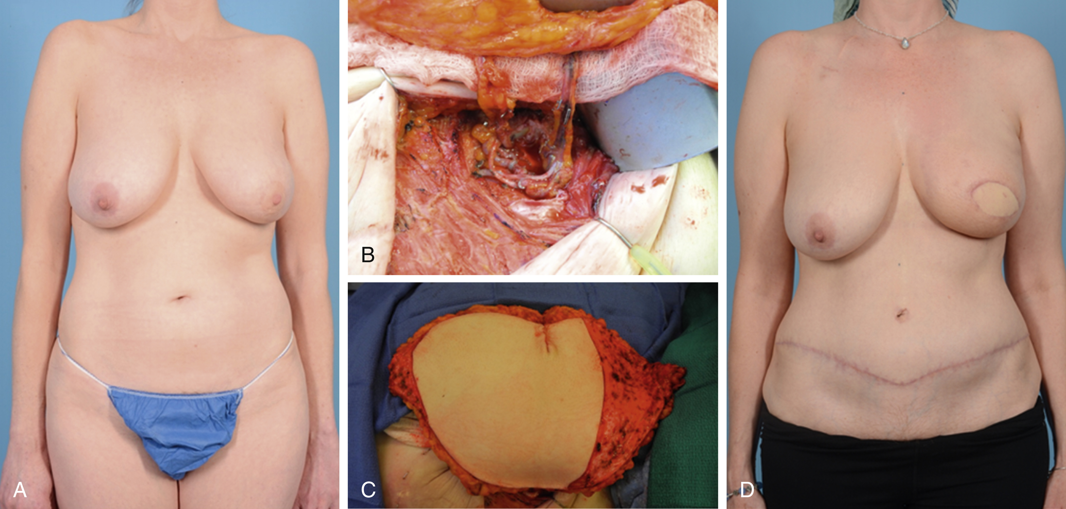 Example of stacked or conjoined DIEP flaps for unilateral breast reconstruction. (A) Preoperative photo. (B) Anastomosis of both pedicles in an antegrade and retrograde fashion to the internal mammary vessels. (C) Perfusion of entire abdomen following anastomoses. (D) Postoperative result at 5 months with no revisions.