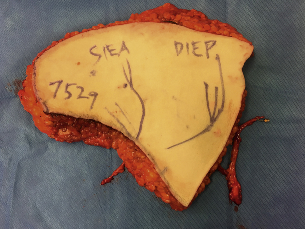 The flap markings and patient setup are the same as for the DIEP flap. The procedure begins with the inferior skin incision just through the dermis, followed by careful dissection through the subcutaneous tissues to identify the SIEV. Deeper dissection, usually lateral to the SIEV and 4–7 cm from the midline, is performed through Scarpa’s fascia to identify the SIEA. If the SIEA is present and suitable for microsurgical anastomosis, the dissection is continued to the origin of the vessels, and the flap dissection is completed by ligating the DIEP perforators. Flap perfusion can be assessed prior to ligation of the DIEP perforators to ensure that adequate blood supply is present. If not, the SIEA is aborted, and a DIEP flap is elevated instead. The flap is then ligated, and microsurgical anastomosis is performed to the internal mammary vessels. The contralateral flap is preferred since this orientation places the pedicle vessels at the medial border of the flap, decreasing the risk of tension or kinking on the anastomosis. If an ipsilateral flap is chosen for the reconstruction, the flap is rotated 180 degrees to line up the SIEA/SIEV with the internal mammary vessels.