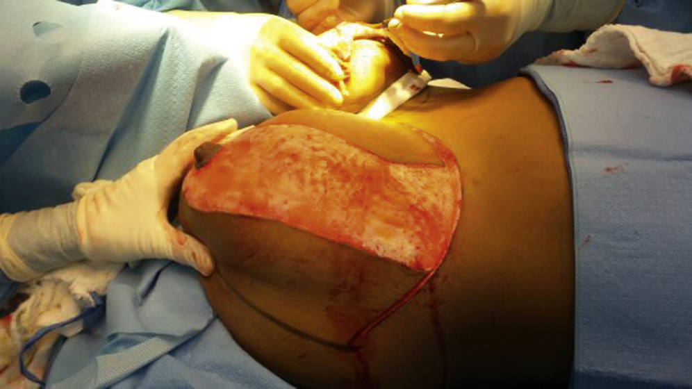 In the no-vertical-scar reduction, I use the inferior pedicle flap. The blood supply to the inferior pedicle comes from the internal mammary artery, the intercostal arteries, and the external branches of the lateral thoracic artery. It is important to not undercut the pedicle to allow the vessels to travel to the breast and the nipple–areola complex.
