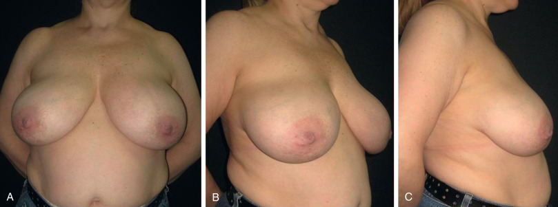 At physical examination, the patient presented with large-based breasts that were bulkier in their lower pole, with a loss in cleavage volume (at the projection of upper quadrants; Fig. 26.1 ). Her inframammary folds showed signs of dermatitis caused by the folding of the breasts over the abdomen, and her shoulders had visible sites of skin depression caused by the brassiere straps. Undoubtedly, there was an indication for surgical treatment of her breasts.
