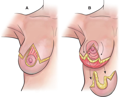 Techniques using periareolar incisions, with a vertical extension, lateral extension (L), and Wise pattern (anchor) have been developed and are used according to the preferences of the patient and surgeon. The Wise pattern is drawn with the junction of two ellipses, one horizontal and another one vertical, which allow for skin redraping over the breasts in a tridimensional fashion, thus helping the reshaping and aesthetic projection of the breasts.
